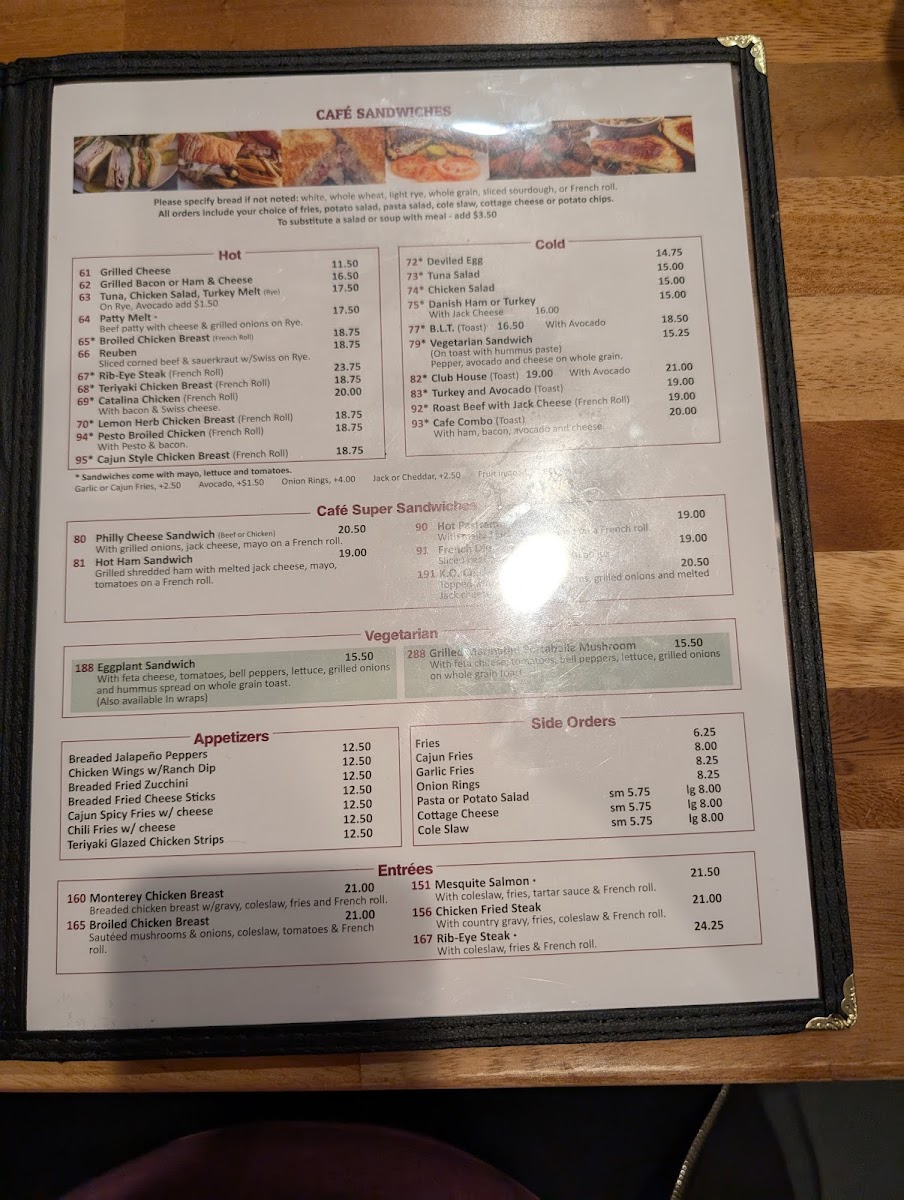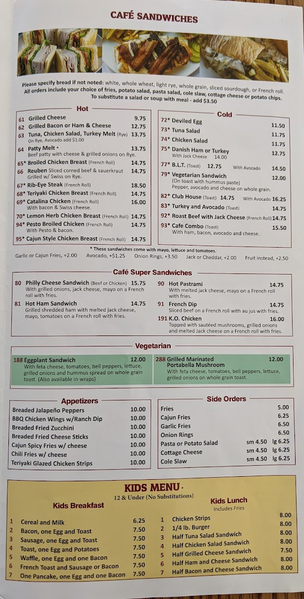 1/4 lb. burger with choice of side: potatoes, hash browns, fruit, salad options, chili, pasta salad, cottage cheese, chips, or soup; including garlic and Cajun fries.